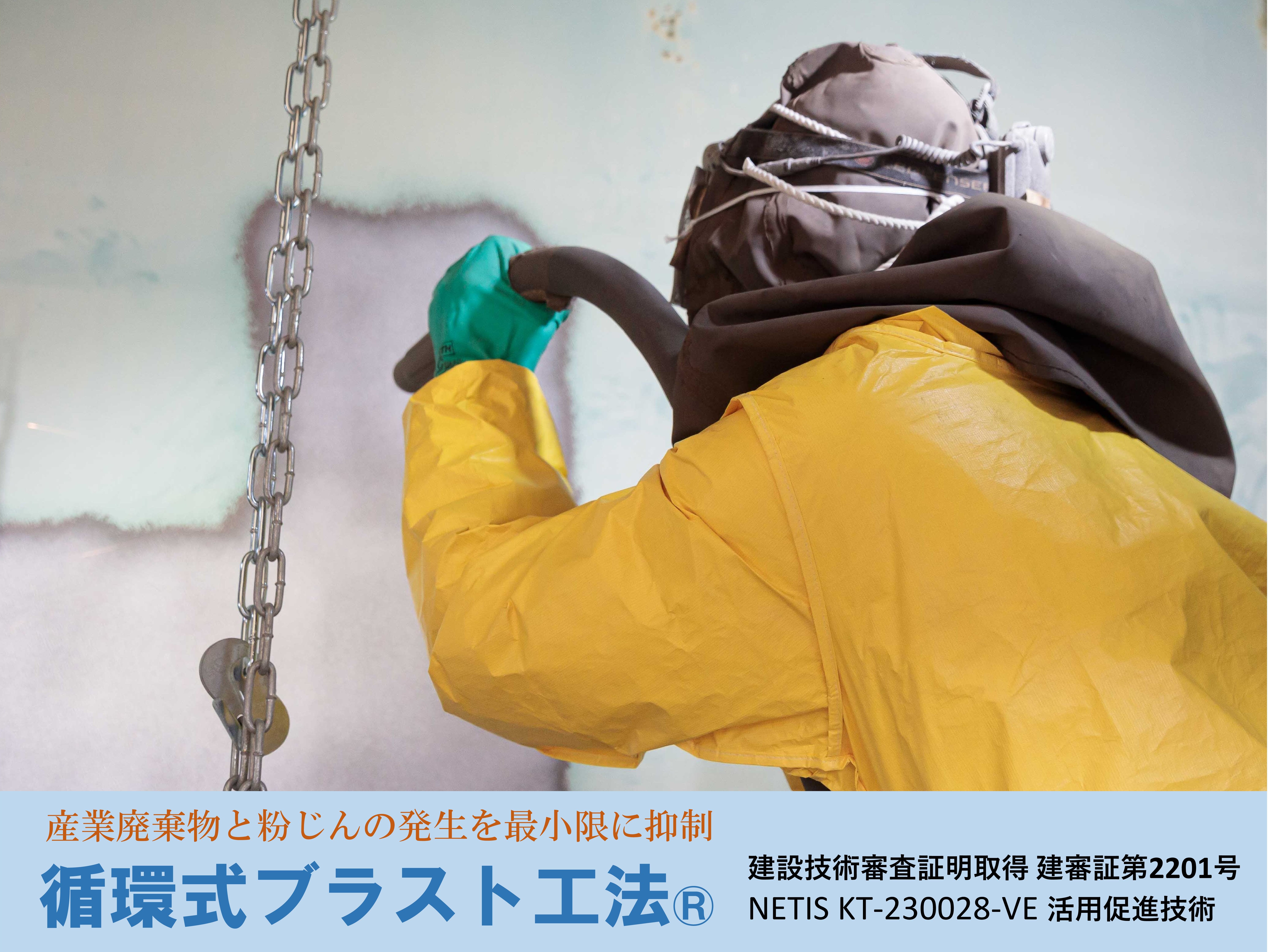- ①循環式ブラスト工法(建設技術審査証明 建審証第2201号、NETIS KT-230028-VE 活用促進技術):耐摩耗性の高い金属系研削材を採用し、剥がした塗膜くずと研削材を共に回収し、両者を選別した上で研削材を循環再利用するブラスト工法。研削材を循環再利用することで、その量に相当する産業廃棄物の発生を抑制し、環境負荷低減を図ることができる。