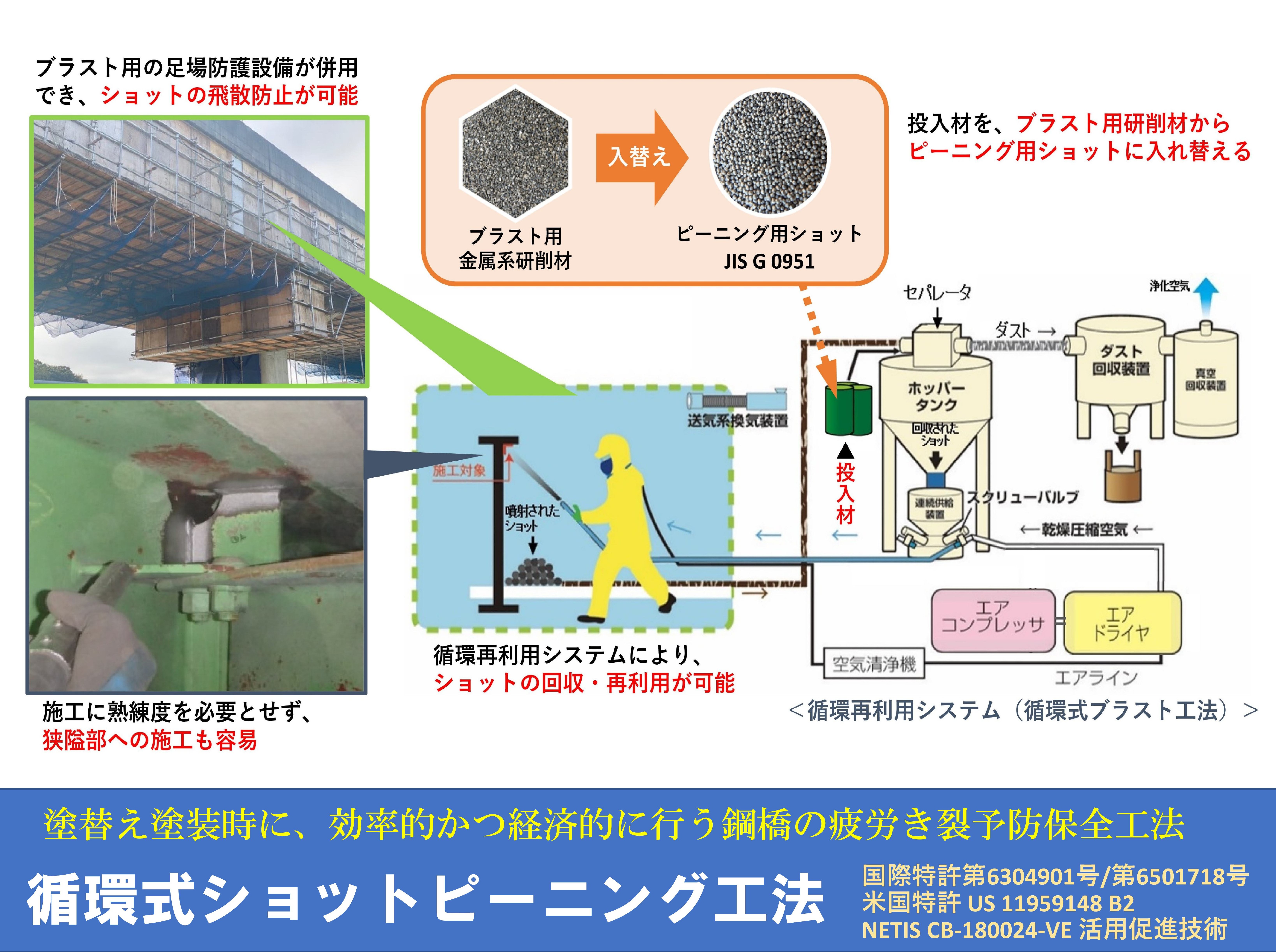 ②循環式ショットピーニング工法(NETIS CB-180024-VE 活用促進技術):上記工法のシステムを活用し、ブラストによる腐食予防に加えて、ショットピーニングによる疲労き裂予防も可能にした鋼製橋梁の予防保全工法。
