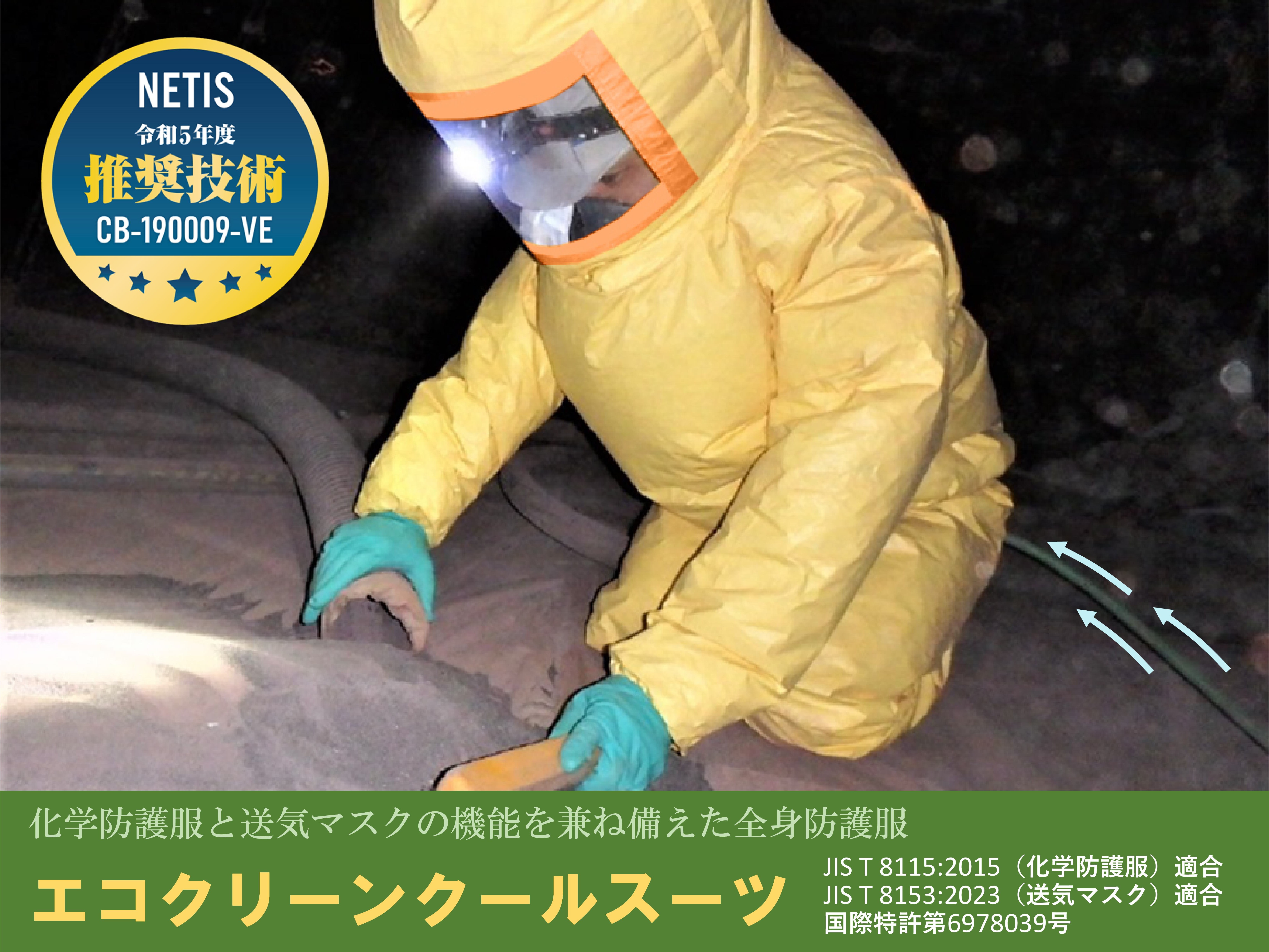 ③エコクリーンクールスーツ(NETIS CB-190009-VE 令和5年度推奨技術):エアライン機能を装備し、冷気変換装置により熱中症対策も可能な上下分離型全身防護服。JIS T 8153(送気マスク)、JIS T 8115(化学防護服)適合品。