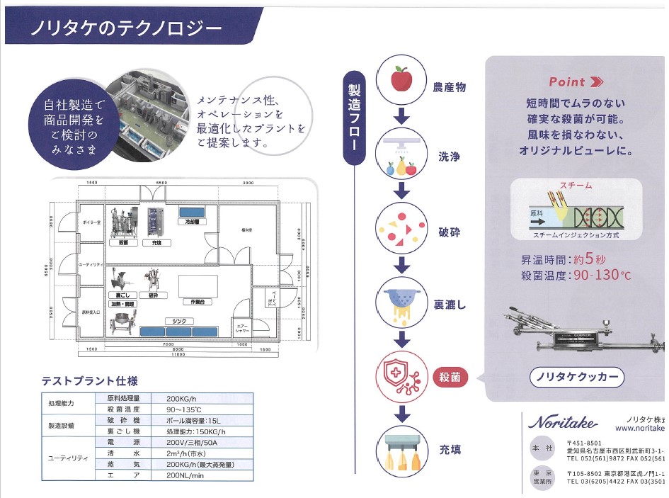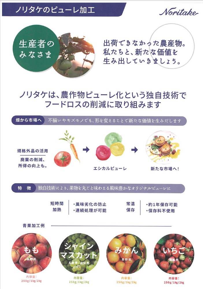 生産者様が出荷できなかった農作物のピューレ化とう技術。こちらは実際に加工された桃と梨のピューレを試飲として来場者様へお配りする予定です!