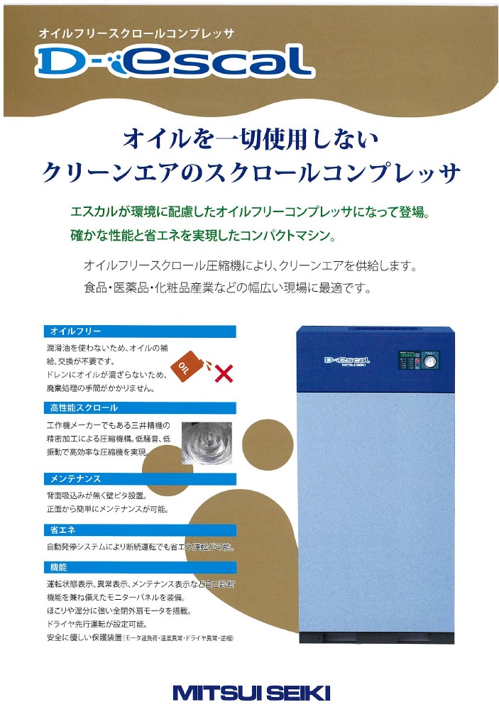 新発売を控えます、オイルを一切使用しないクリーンエアのスクロールコンプレッサ。