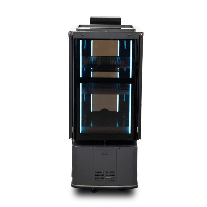 2.エレベータ連携可能な、デリバリーロボット「NAOMI-2」は、夜間の客室からホテルフロントへのリクエストに応える、アメニティ搬送やルームサービスなどを人に変わって客室へ運びます。夜間のワンオペなどにも最適です。