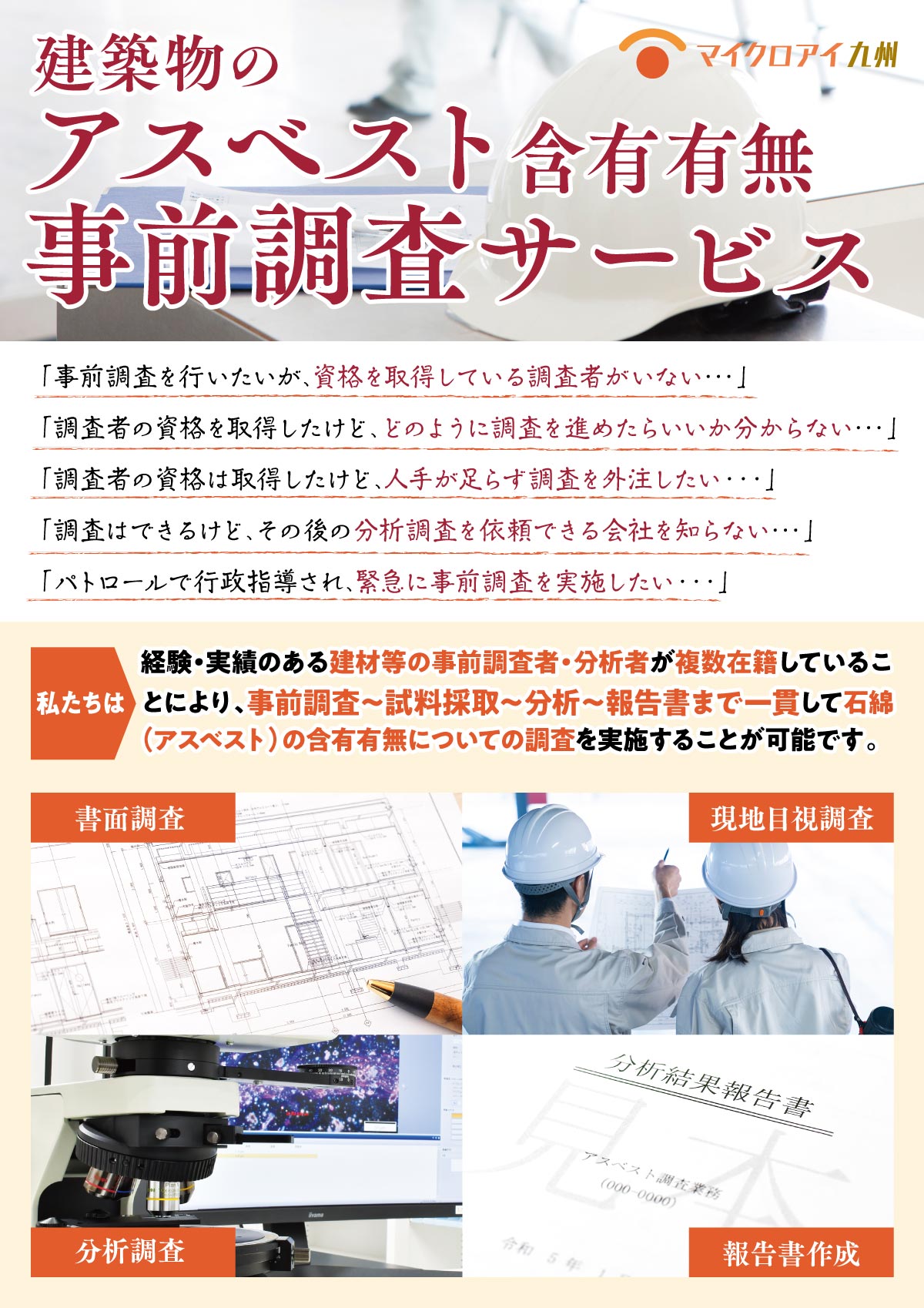 書面調査・目視調査・試料採取・アスベスト定性分析までを一元管理し、顧客・官公署へ提出可能な報告書を自動生成。日々のご負担や属人化の課題に寄り添い、業務効率と品質向上をしっかり支えます。
