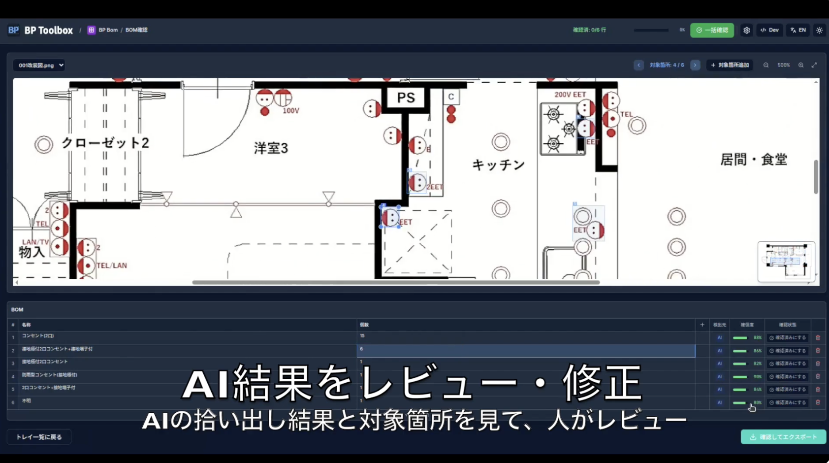 専門知識やAIスキルがなくても使える設計で、誰でも簡単に業務効率化とミス削減を実現できます。また、建築図面、設備図面、施工図、配管図など幅広い図面に対応し、従来人手に依存していた確認作業を標準化・高速化します。