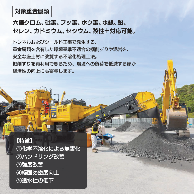 - トンネルおよびシールド工事で発生する、重金属類を含有した環境基準不適合の掘削ずりや泥岩を、安全な盛土材に改質する不溶化処理工法。