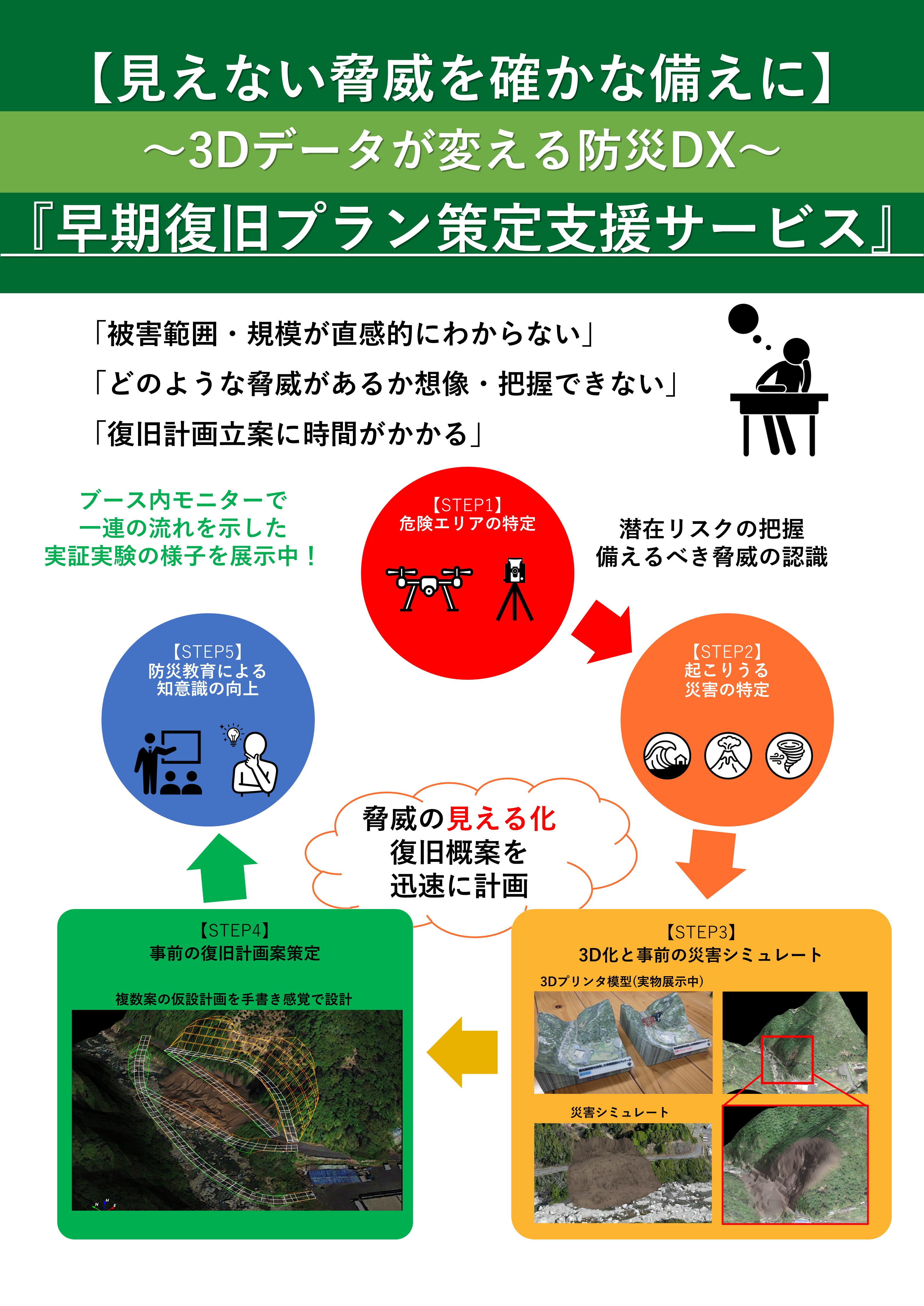さらに被害発生後は、BCPに必要な情報を1つにまとめて確認ができるオールインワンサービスの活用により、企業の早期復旧を図る「危機管理・早期復旧策定支援サービス」を提供します。 - ブースのみどころ