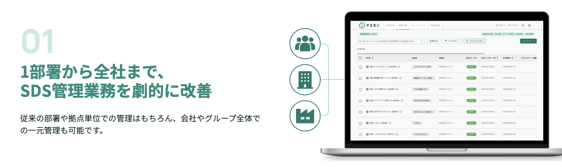 - ケミカンは、SDSをデータベース化することで、SDSの一元管理から配布管理など様々なSDS関連業務を支援するプラットフォームの提供を目指しています。現在は2つのプロダクト「ケミカンSDS管理」「ケミカン配布管理」を提供しています。