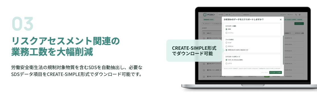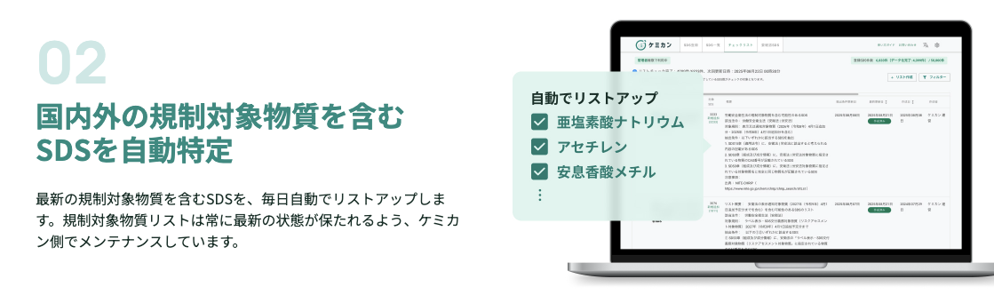 ●製品1:ケミカンSDS管理は、SDSをデータ化して、SDS管理を一元化するクラウドサービスです。SDSを正確にデータ化し検索性を高めることで、各種法令に該当する化学品・化学物質の特定やリスクアセスメントの業務効率化を支援します。