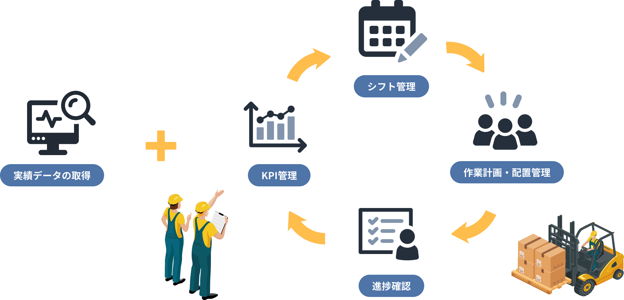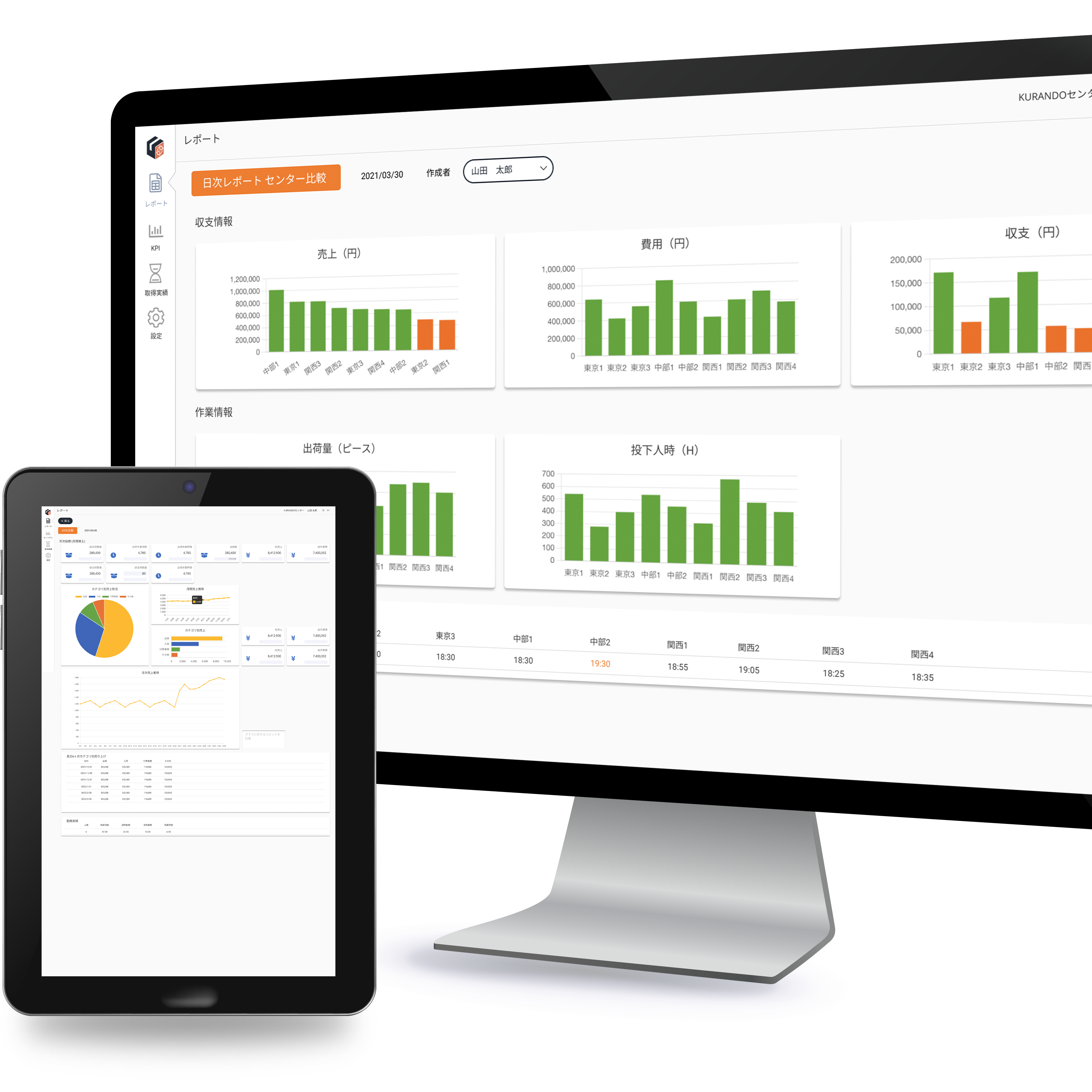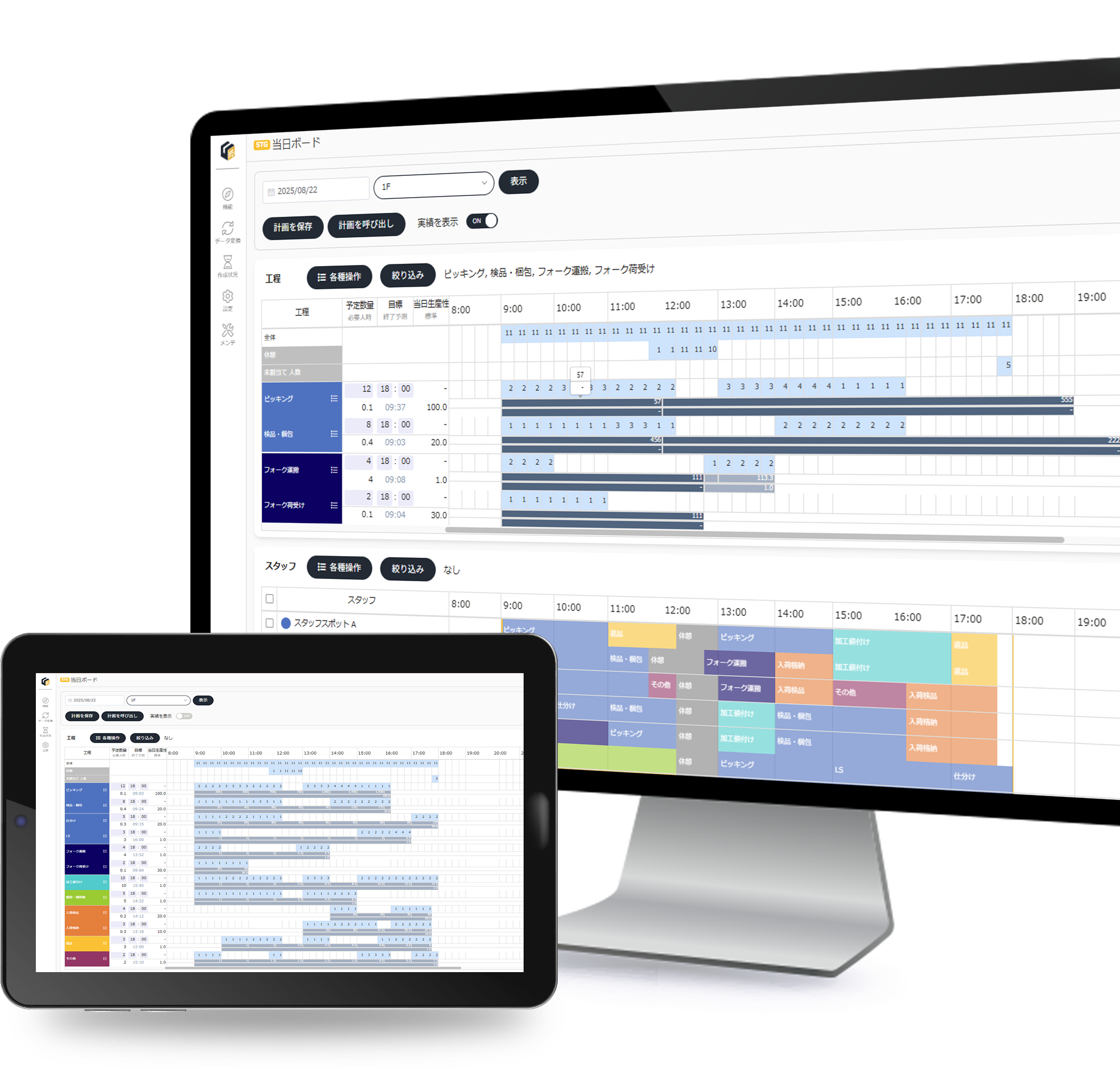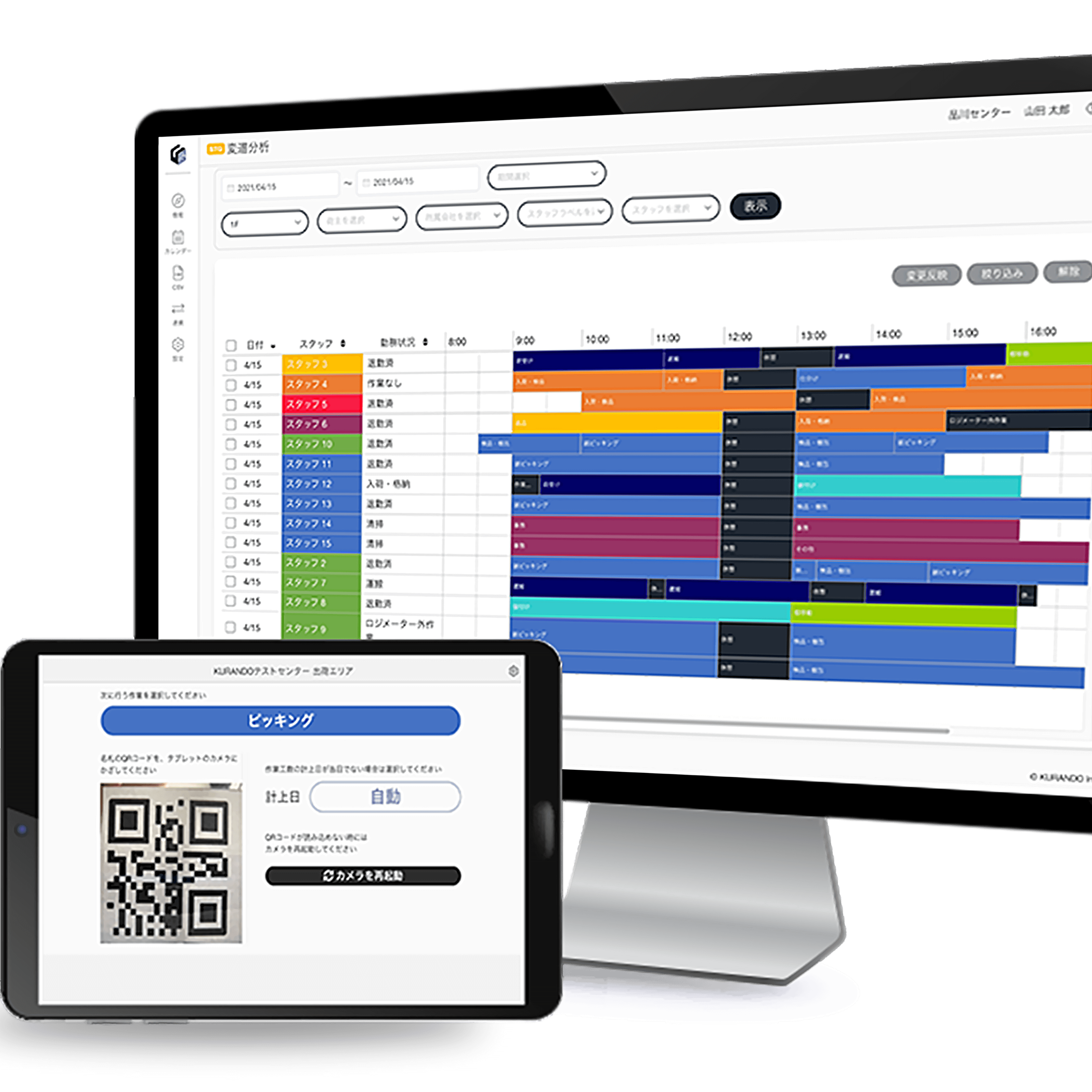 タブレットで取得した作業実績から生産性や収支のレポートを自動作成することや、取得したデータを基に定量的なシフト調整、進捗管理を行うことができる庫内管理支援ツールです。