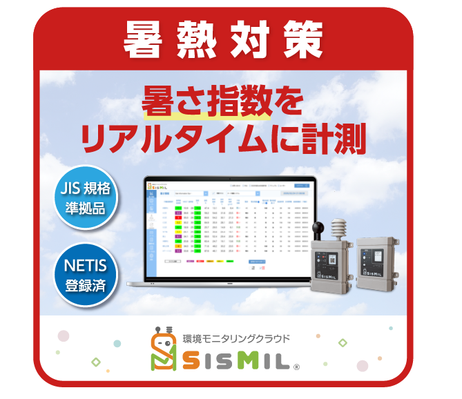 - 「SisMil(シスミル)」は、暑さ指数(WBGT)などの環境測定値を遠隔から一元管理できるクラウド型モニタリングシステムです。現場や施設内の複数地点を遠隔監視でき、暑熱リスクの早期発見と安全管理の強化を実現します。また、作業者が危険を即座に認識できるよう、危険リスクをリアルタイムに周知する多彩な連携オプションもご用意しております。暑熱対策をご検討中の企業・団体様はぜひお立ち寄りください。