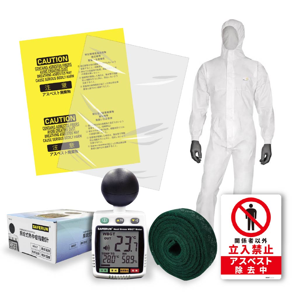 アスベスト解体関連の商品(看板、廃棄用袋、防護服関連など)、