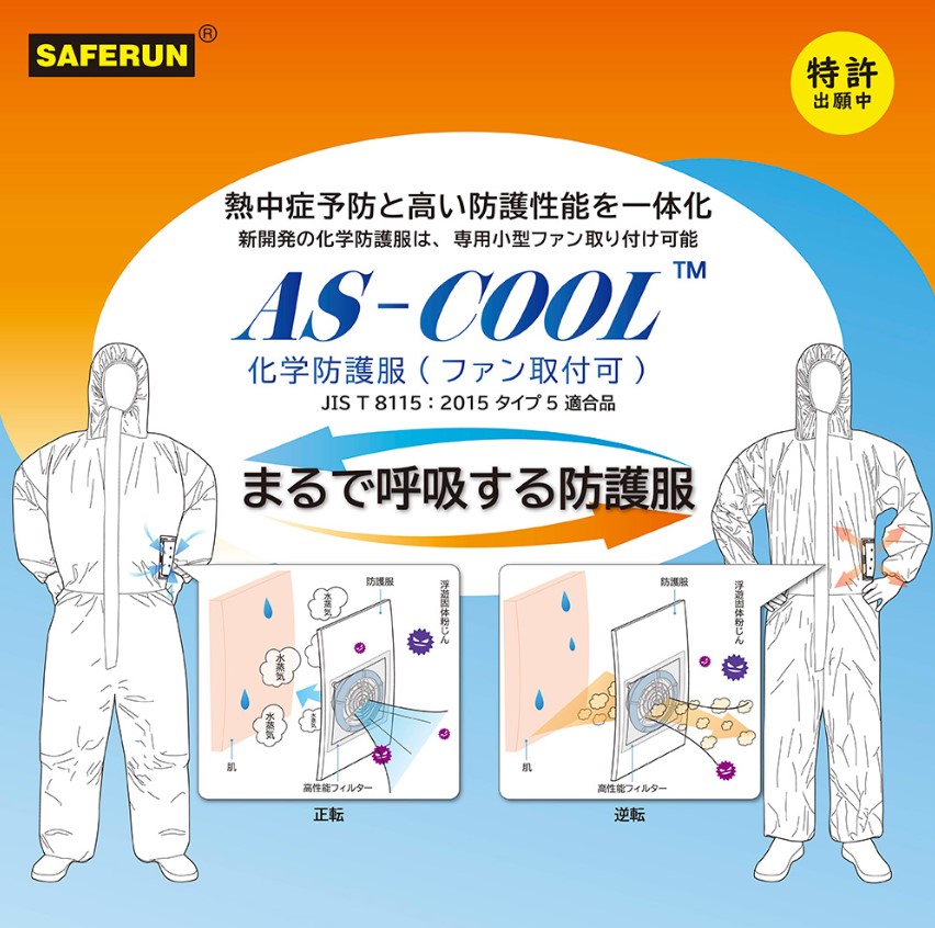 - 粉じん環境下でもご使用いただける、化学防護服(ファン取付可)JIS T 8115タイプ5)適合品をメインとしたアスベスト解体関連の商品(看板、廃棄用袋、防護服関連など)をはじめ、転倒防止、衝突防止、安全標識、各種PPE、熱中症対策、その他安全用品各種を展示、ご紹介いたします。