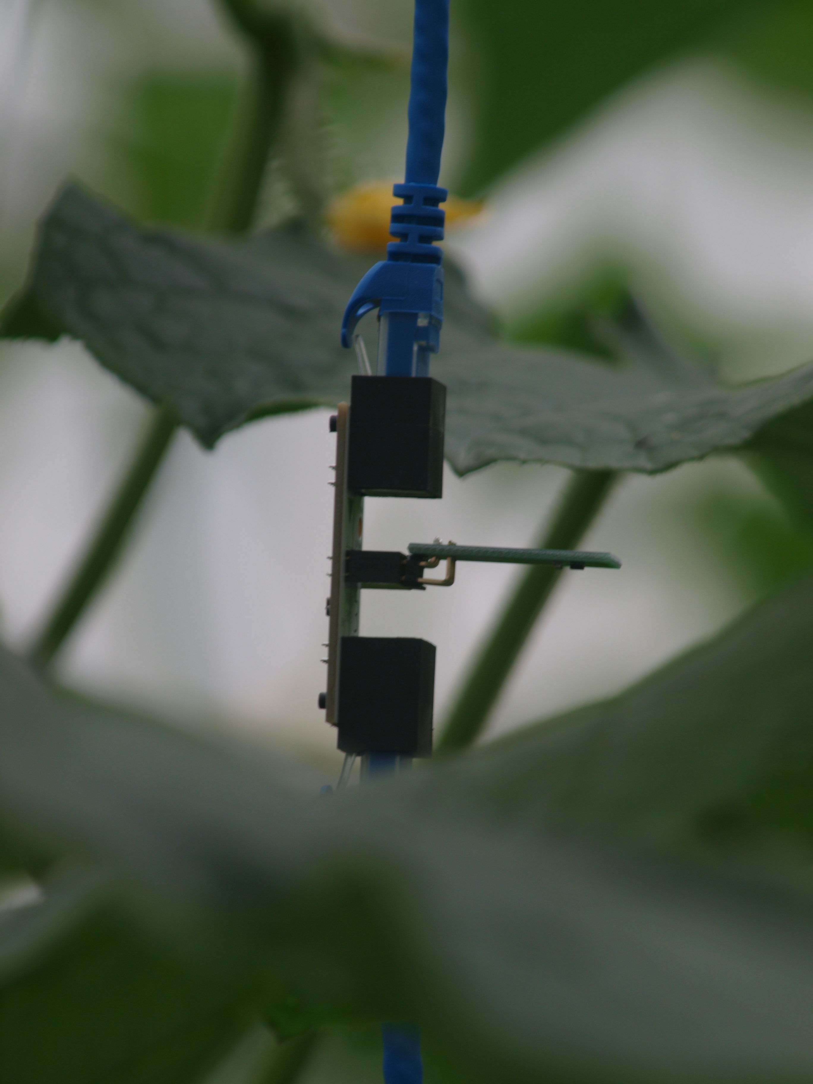 このシステムは簡素で低コストな構造で栽培施設内の環境を計測し、計測値をネットに配信する機能を持ちます。現在久留米事業場でキュウリを栽培する高軒高ハウス内の192点で温度・日照を計測し、計測値をインターネット上のデータベースに送信しています。計測点は栽培ベッドごとに水平・垂直方向に0.5m間隔で設置され、1秒ごとの計測・配信を続けています。配信された計測値はスマホなどで受け取ることもできます。久留米のほかにも合志や宮崎市など九州各地で設置・計測した実績があります。