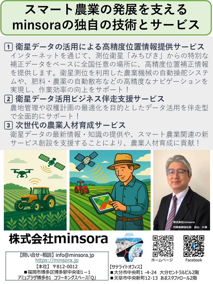 minsoraの衛星測位を活用したサービス:衛星からのデータを解析し、自動操舵システムなどスマート農機と連動した農作業の効率化や農地の健康状態のモニタリングを支援します。適切なタイミングでの灌漑や施肥を提案し、生産性向上を実現します。