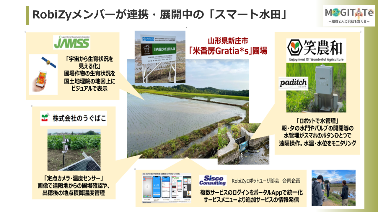 - MOGITATeのスマート農業コンサルサービス:NPO法人ロボットビジネス支援機構(RobiZy)のメンバーと連携して展開している「スマート水田」の事例などを紹介しながら、 農業の効率化と収益性の向上を目指し、最新技術や農業プロセス改善の提案を行います。