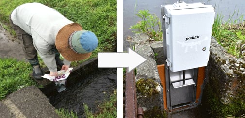 笑農和(えのわ)の水田の水管理システム「paditch」:スマートフォンを使った遠隔操作で水田の水管理を簡単に行うシステムです。水位の調整や中干しモードが可能で、収量や品質の向上に加え、田んぼ由来のカーボンクレジットの創出もサポートします。